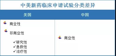 在美國(guó),新藥臨床申請(qǐng)?jiān)囼?yàn)分為商業(yè)性和非商業(yè)性?xún)深?lèi)。非商業(yè)性申請(qǐng)目的分為研究性、急救性、治療性新藥臨床試驗(yàn)申請(qǐng),此類(lèi)申請(qǐng)高于商業(yè)性申請(qǐng)。而我國(guó)新藥臨床研究申請(qǐng)主要目的是商業(yè)性的,即申請(qǐng)新藥通過(guò)臨床研究,最終投入生產(chǎn)銷(xiāo)售。