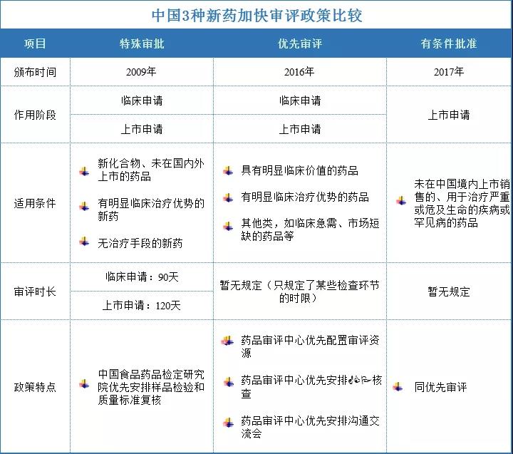 中國(guó)新藥上市加快審評(píng)審批政策包括4種類(lèi)型,分別是特別審批、特殊審批、優(yōu)先審評(píng)、有條件批準(zhǔn)。由于“特別審批”涉及重大突發(fā)衛(wèi)生公共事件,滿(mǎn)足條件的品種很少,因此,通常情況下中國(guó)新藥上市加快審評(píng)類(lèi)型可以歸納為3種,分別是特殊審批、優(yōu)先審評(píng)、有條件批準(zhǔn)。