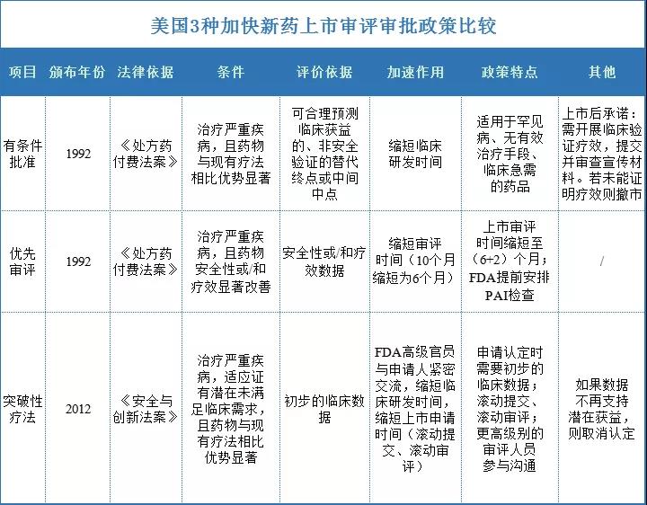 美國(guó)的新藥上市加快審評(píng)審批的政策有3種,分別是突破性療法(breakthrough therapy)、優(yōu)先審評(píng)( priority review)、有條件批準(zhǔn)(accelerated approval)。