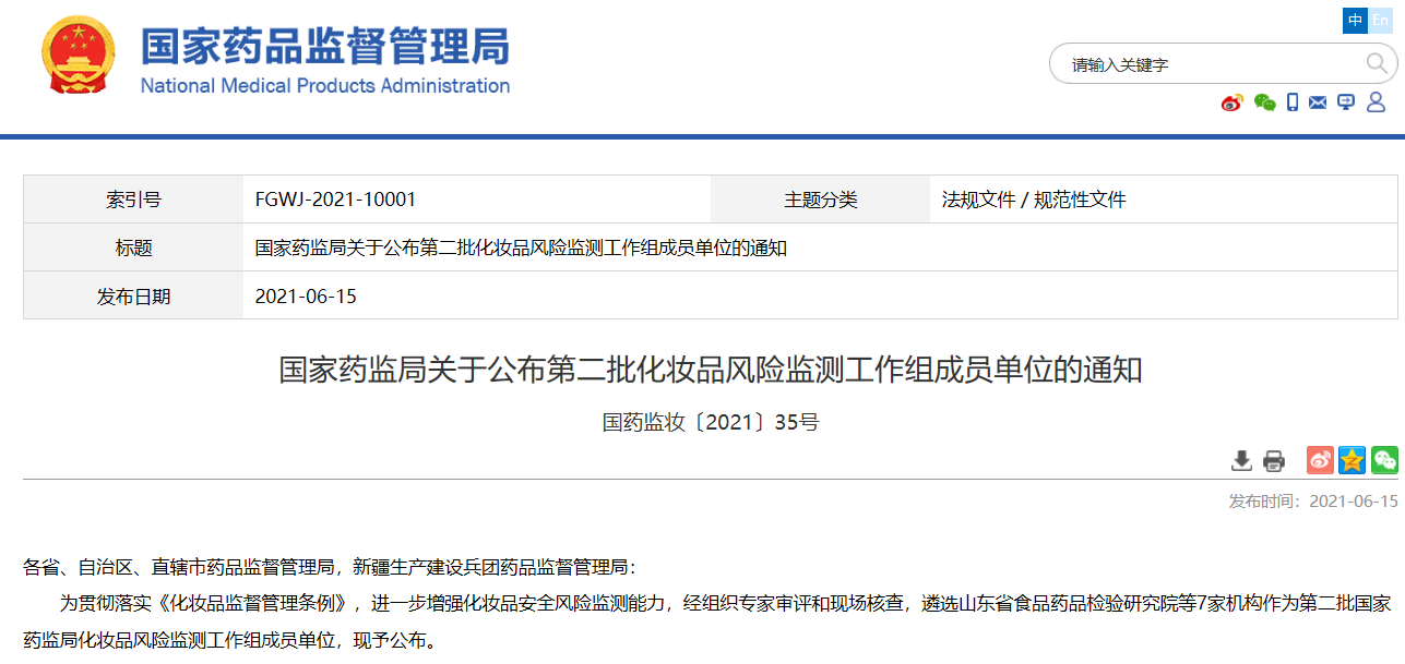國(guó)家藥監(jiān)局關(guān)于公布第二批化妝品風(fēng)險(xiǎn)監(jiān)測(cè)工作組成員單位的通知