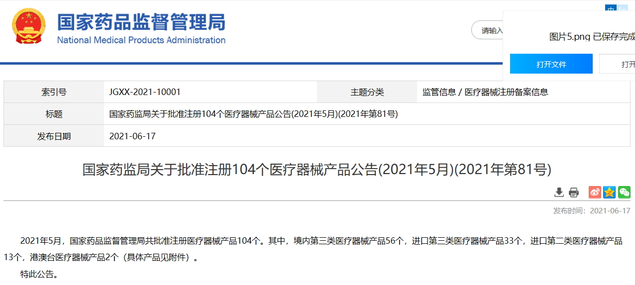 國(guó)家藥監(jiān)局關(guān)于批準(zhǔn)注冊(cè)104個(gè)醫(yī)療器械產(chǎn)品公告(2021年5月)(2021年第81號(hào))