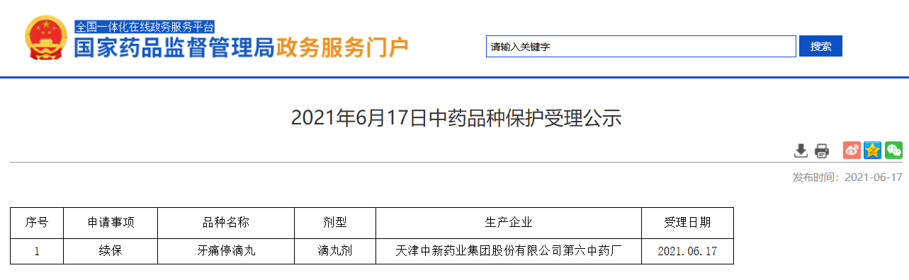 2021年6月17日中藥品種保護(hù)受理公示