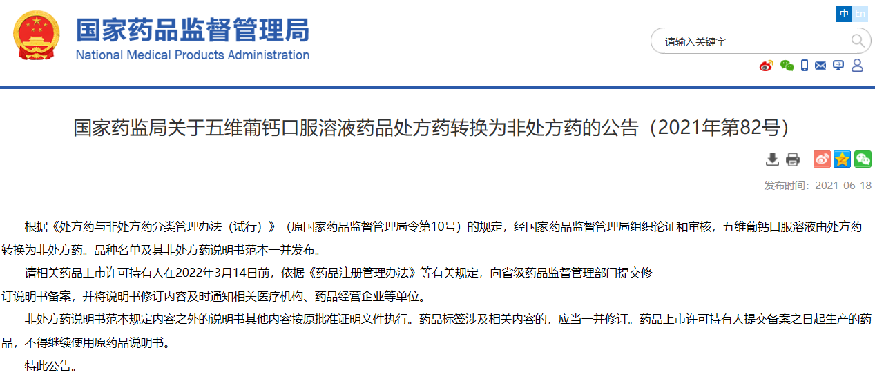 國(guó)家藥監(jiān)局關(guān)于五維葡鈣口服溶液藥品處方藥轉(zhuǎn)換為非處方藥的公告(2021年第82號(hào))