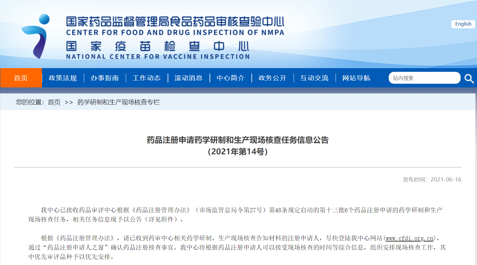 藥品注冊(cè)申請(qǐng)藥學(xué)研制和生產(chǎn)現(xiàn)場(chǎng)核查任務(wù)信息公告(2021年第14號(hào))