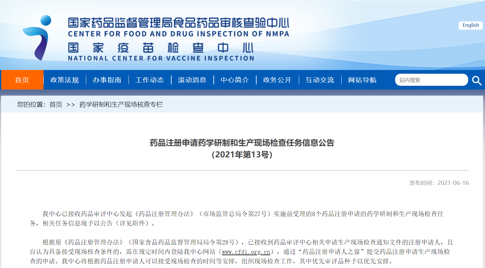 藥品注冊(cè)申請(qǐng)藥學(xué)研制和生產(chǎn)現(xiàn)場(chǎng)檢查任務(wù)信息公告(2021年第13號(hào))