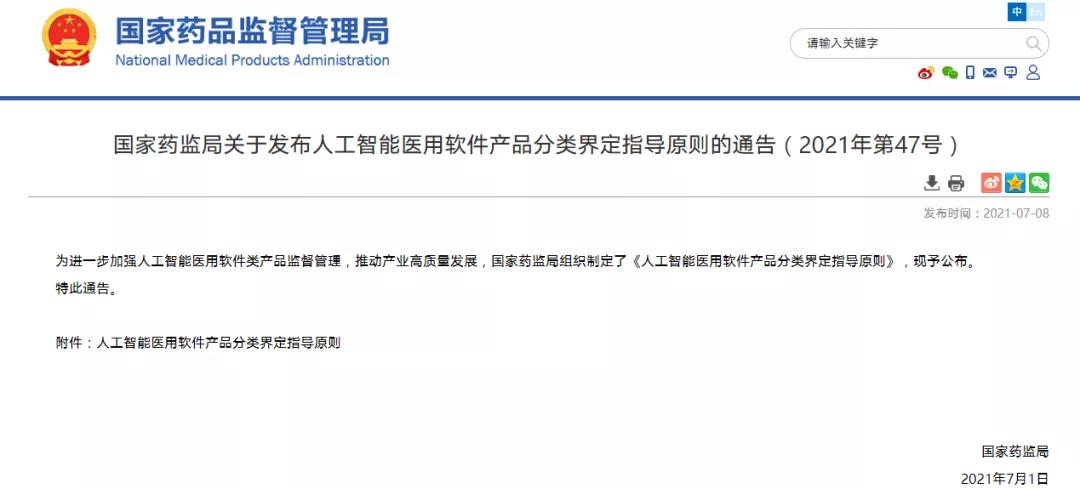 國家藥監(jiān)局關(guān)于發(fā)布人工智能醫(yī)用軟件產(chǎn)品分類界定指導(dǎo)原則的通告(2021年第47號) (2021-07-08)