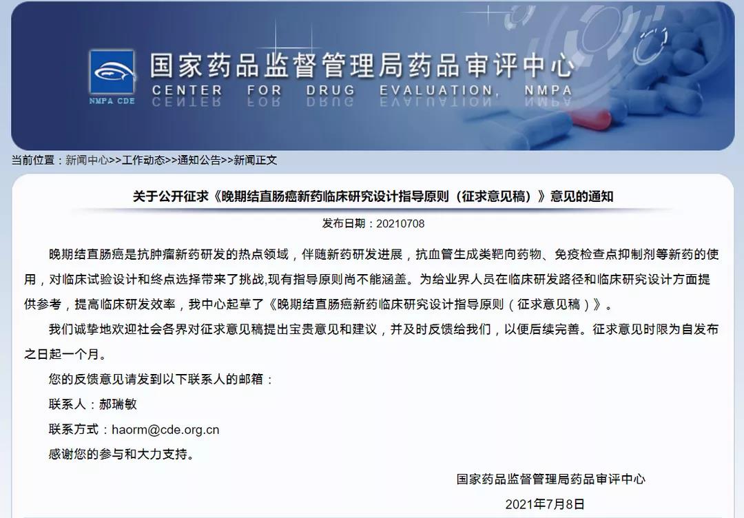關(guān)于公開征求《晚期結(jié)直腸癌新藥臨床研究設(shè)計指導(dǎo)原則(征求意見稿)》意見的通知