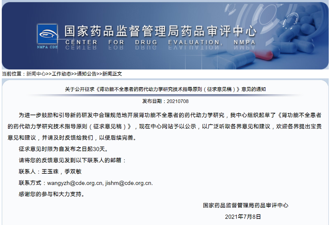關(guān)于公開征求《腎功能不全患者的藥代動力學(xué)研究技術(shù)指導(dǎo)原則(征求意見稿)》意見的通知