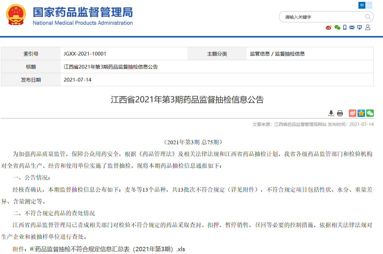 江西省2021年第3期藥品監(jiān)督抽檢信息公告