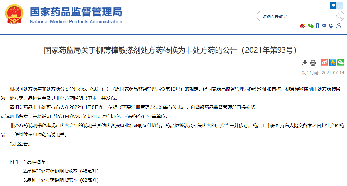 關(guān)于柳薄樟敏搽劑處方藥轉(zhuǎn)換為非處方藥的公告(2021年第93號)