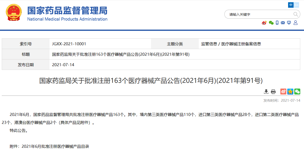 關(guān)于批準(zhǔn)注冊163個醫(yī)療器械產(chǎn)品公告(2021年6月)(2021年第91號)