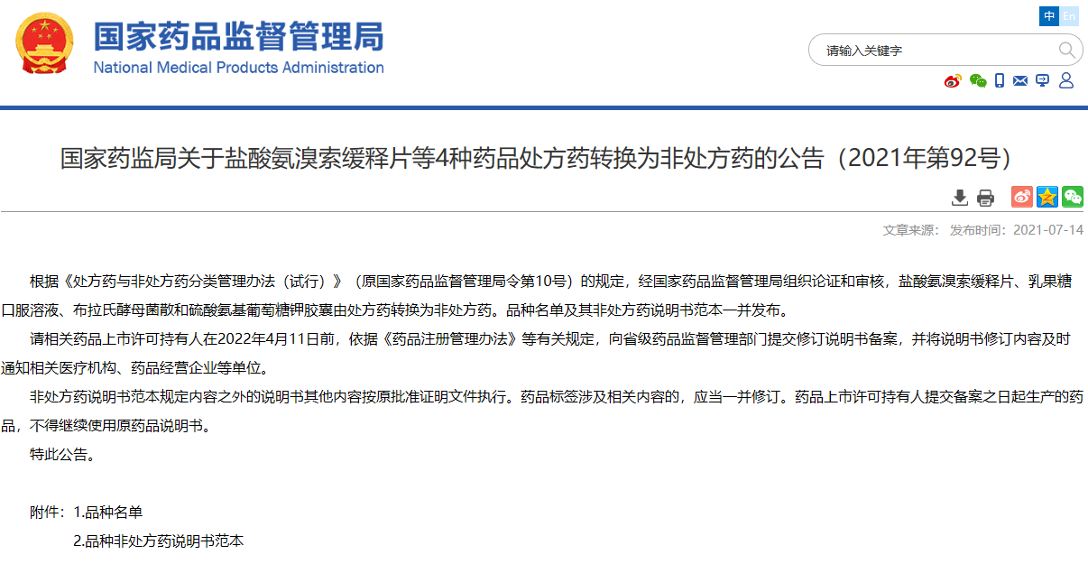 關(guān)于鹽酸氨溴索緩釋片等4種藥品處方藥轉(zhuǎn)換為非處方藥的公告(2021年第92號)
