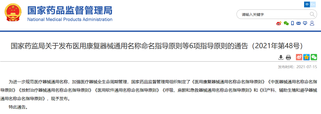 關(guān)于發(fā)布醫(yī)用康復(fù)器械通用名稱命名指導(dǎo)原則等6項指導(dǎo)原則的通告(2021年第48號)