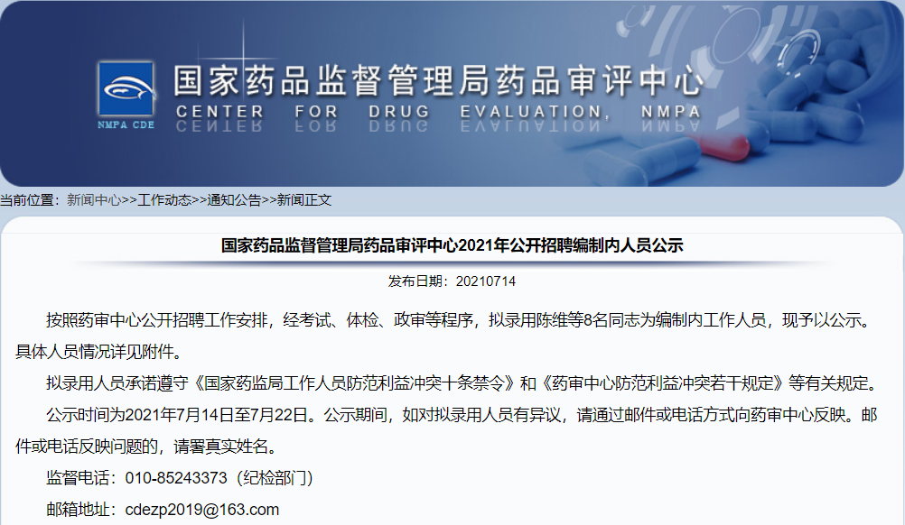 國家藥品監(jiān)督管理局藥品審評中心2021年公開招聘編制內(nèi)人員公示