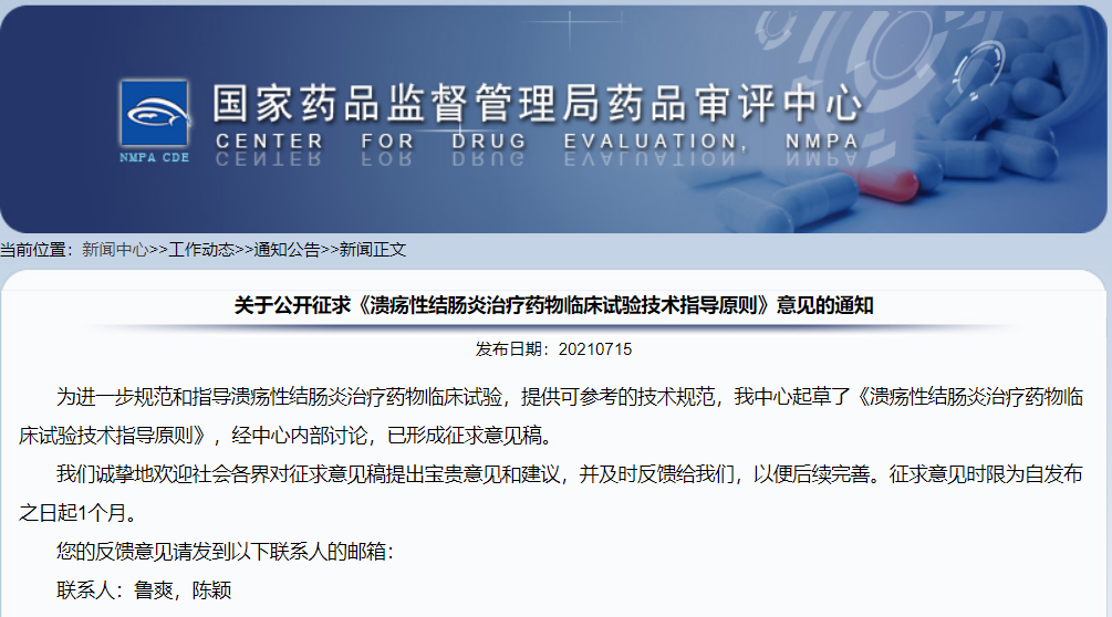 關(guān)于公開征求《潰瘍性結(jié)腸炎治療藥物臨床試驗技術(shù)指導(dǎo)原則》意見的通知
