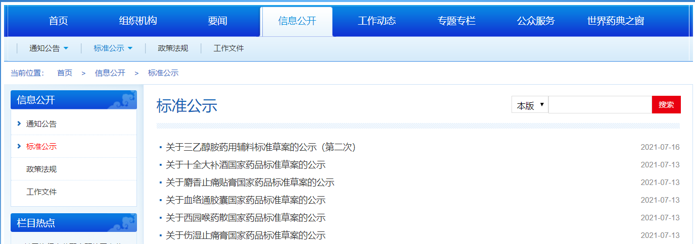 本周三乙醇胺藥用輔料標(biāo)準(zhǔn)草案公示(第二次),全大補(bǔ)酒、麝香止痛貼膏、血絡(luò)通膠囊、西園喉藥散、傷濕止痛膏國家藥品標(biāo)準(zhǔn)草案公示。