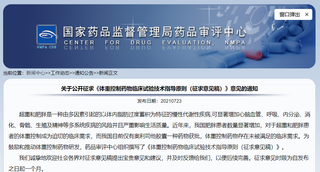 關(guān)于公開征求《體重控制藥物臨床試驗(yàn)技術(shù)指導(dǎo)原則(征求意見稿)》意見的通知