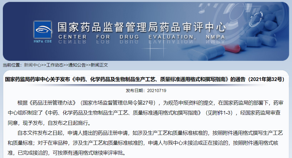 關(guān)于發(fā)布《中藥、化學(xué)藥品及生物制品生產(chǎn)工藝、質(zhì)量標(biāo)準(zhǔn)通用格式和撰寫指南》的通告(2021年第32號(hào))