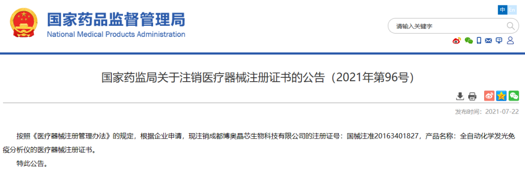 國(guó)家藥監(jiān)局關(guān)于注銷醫(yī)療器械注冊(cè)證書的公告(2021年第96號(hào))