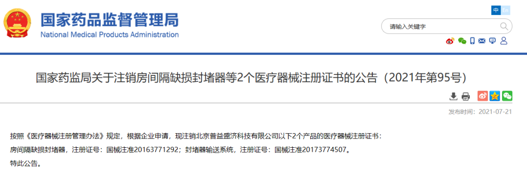 關(guān)于注銷房間隔缺損封堵器等2個(gè)醫(yī)療器械注冊(cè)證書的公告(2021年第95號(hào))
