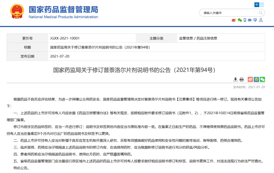 關(guān)于修訂普萘洛爾片劑說明書的公告(2021年第94號(hào))