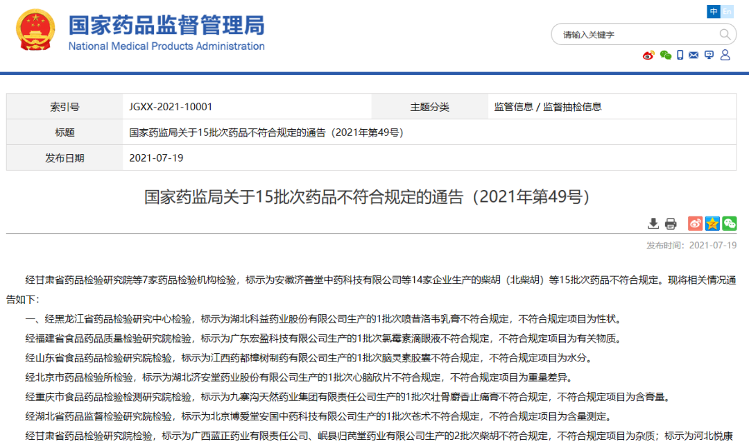 關(guān)于15批次藥品不符合規(guī)定的通告(2021年第49號(hào))