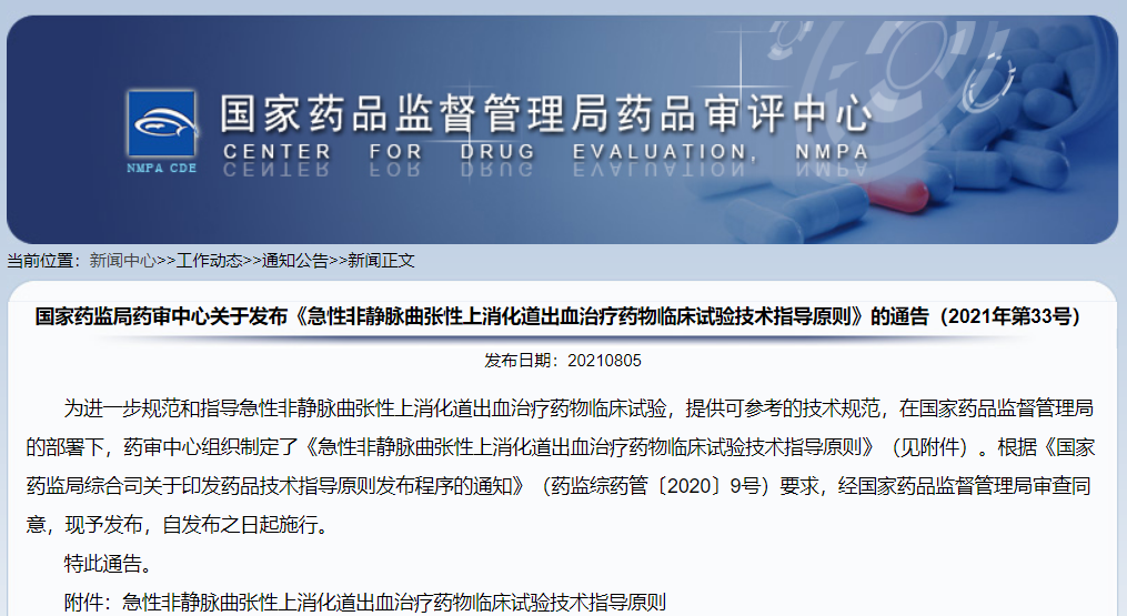 關(guān)于發(fā)布《急性非靜脈曲張性上消化道出血治療藥物臨床試驗(yàn)技術(shù)指導(dǎo)原則》的通告(2021年第33號)