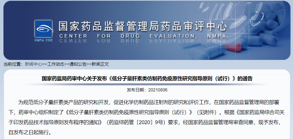 關(guān)于發(fā)布《低分子量肝素類仿制藥免疫原性研究指導(dǎo)原則(試行)》的通告
