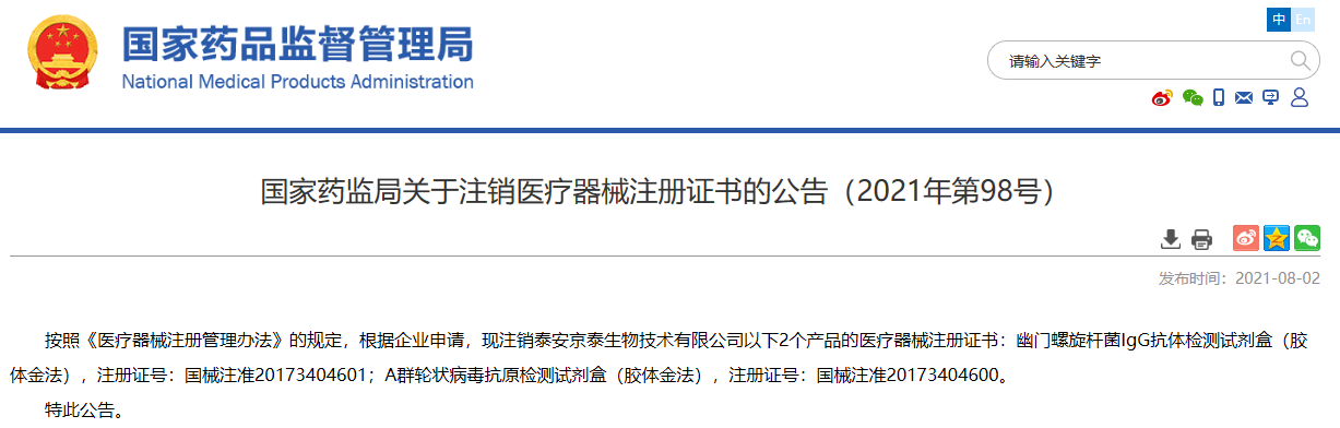 關(guān)于注銷醫(yī)療器械注冊證書的公告(2021年第98號)