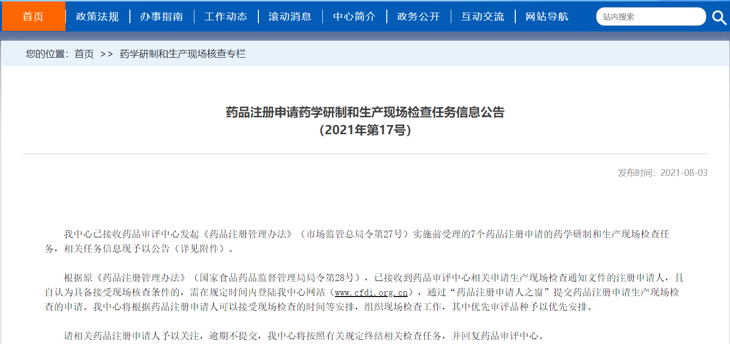 藥品注冊申請藥學(xué)研制和生產(chǎn)現(xiàn)場檢查任務(wù)信息公告(2021年第17號)
