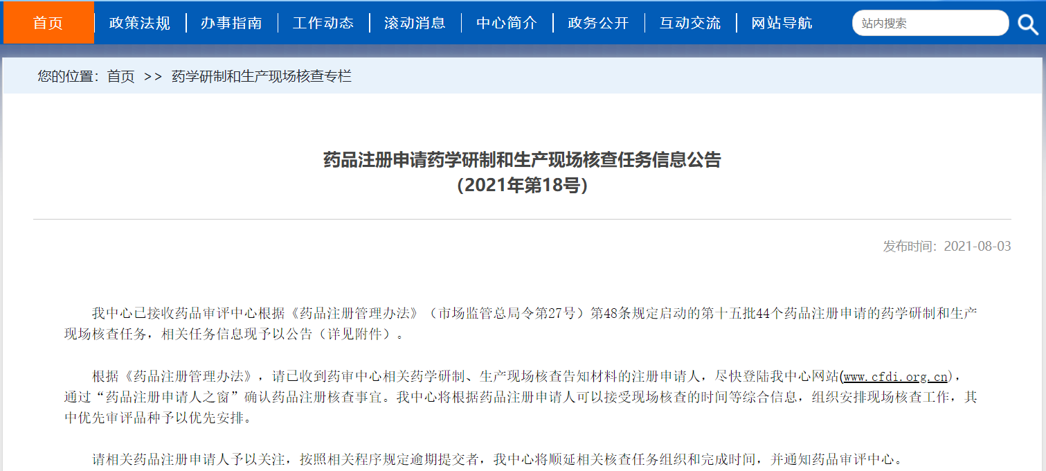 藥品注冊申請藥學(xué)研制和生產(chǎn)現(xiàn)場核查任務(wù)信息公告(2021年第18號)