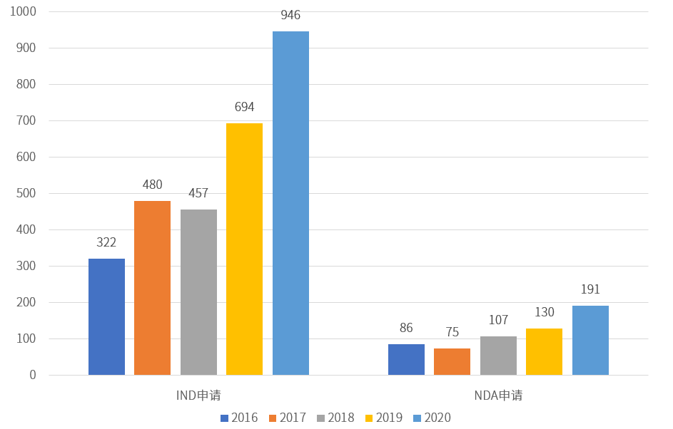2016-2020 國(guó)內(nèi)創(chuàng)新藥IND、NDA申請(qǐng)數(shù)量