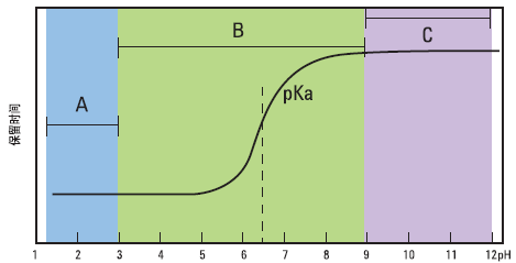 流動相pH值一般選取pKa±2范圍之外,以保障化合物處于分子狀態(tài),減少電離,此狀態(tài)下化合物疏水性較強,色譜柱保留時間較長,能獲得良好的峰型。