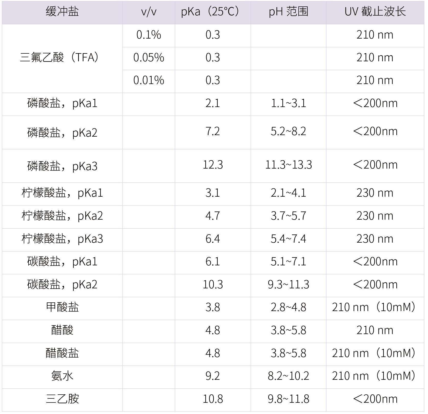 緩沖體系選擇的要求:能適當控制離子化、與檢測器兼容性、緩沖鹽溶液與有機相的互溶性、流動相的pH是否在色譜柱的安全范圍內(nèi)。