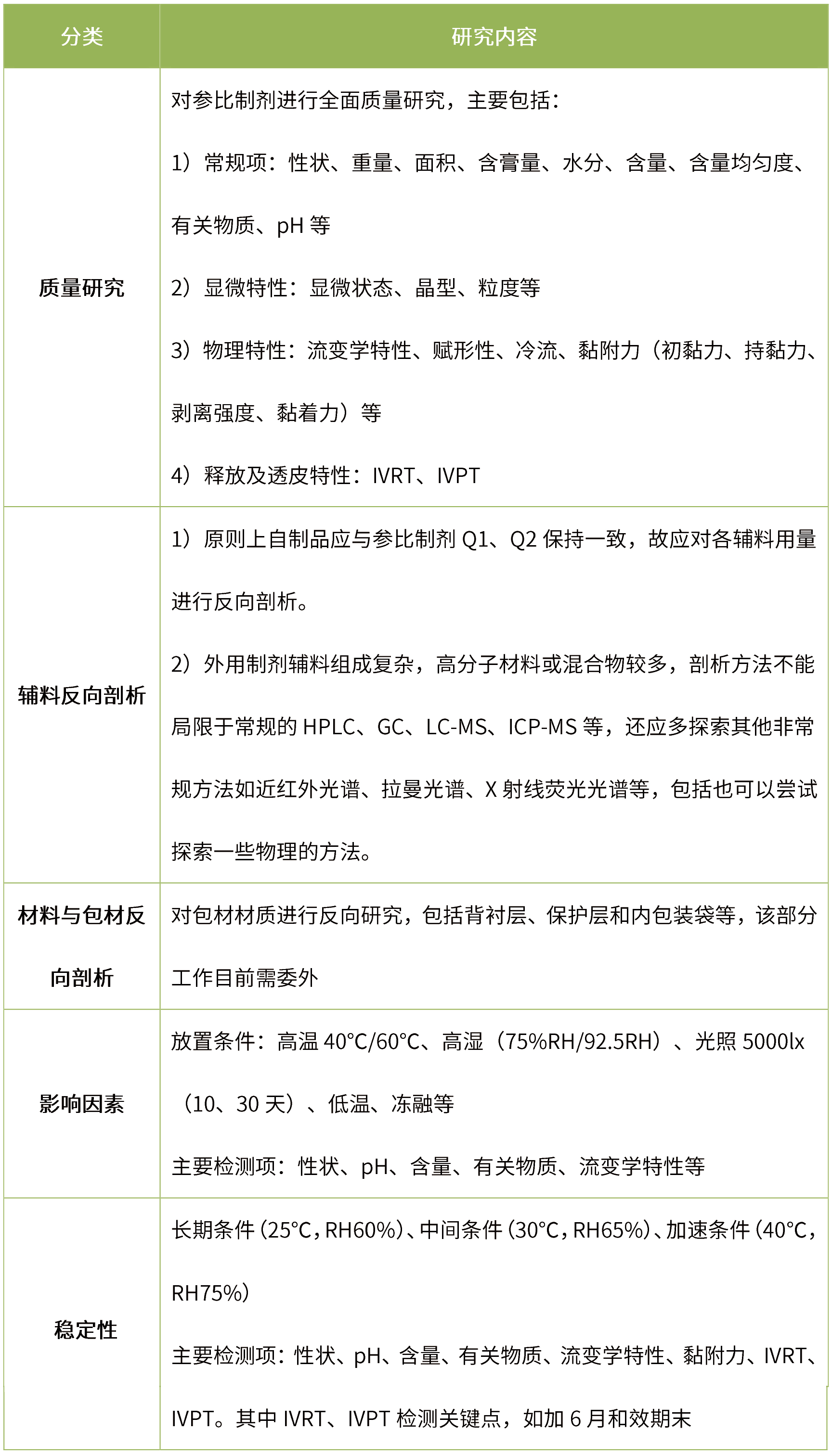 對小試放大樣品進(jìn)行全面質(zhì)量研究,包括常規(guī)項(xiàng)(性狀、含膏量、水分、含量、含量均勻度、有關(guān)物質(zhì)、pH等)、顯微特性(顯微狀態(tài)、晶型、粒度等)、流變學(xué)特性、賦形性、冷流、黏附力(初黏力、持黏力、剝離強(qiáng)度、黏著力)、IVRT、IVPT等,各質(zhì)量屬性應(yīng)與參比制劑一致。