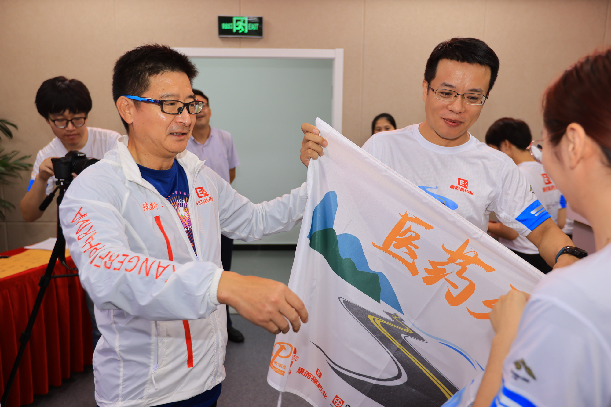 ▲醫(yī)藥天團(tuán)越山向海發(fā)起人、新領(lǐng)先醫(yī)藥董事長(zhǎng)陶新華先生分別向各戰(zhàn)隊(duì)授予“醫(yī)藥天團(tuán)”旗幟