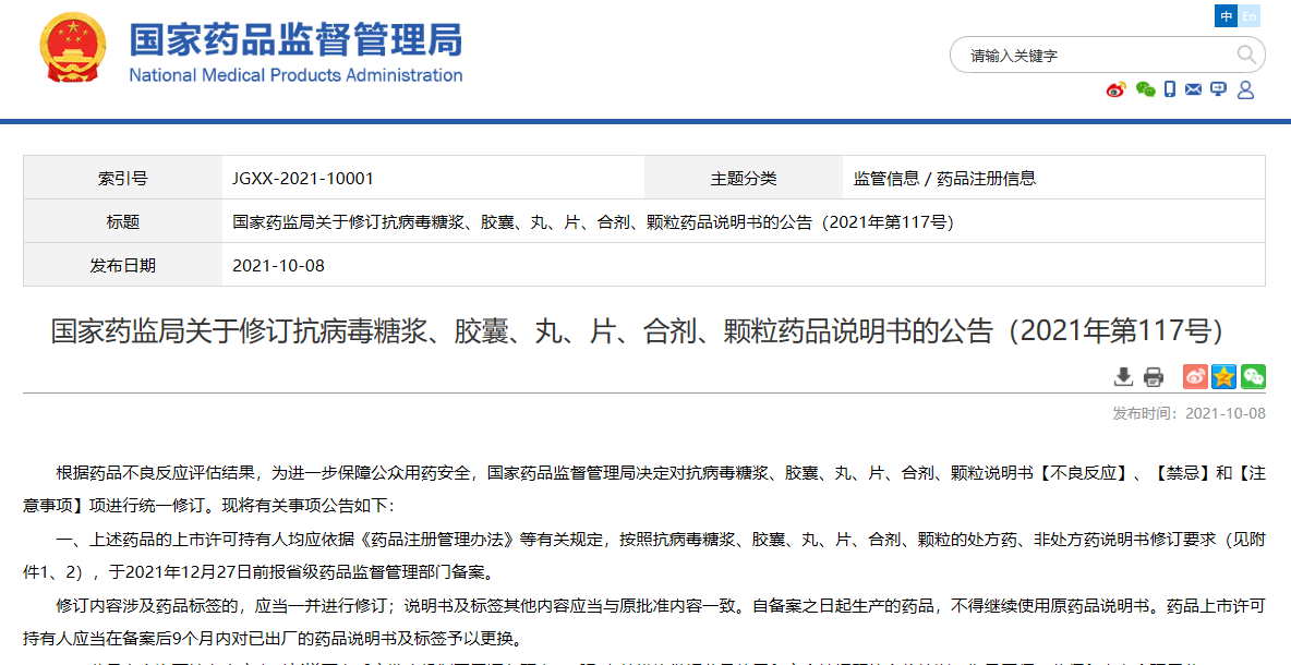 國家藥監(jiān)局關于修訂抗病毒糖漿、膠囊、丸、片、合劑、顆粒藥品說明書的公告(2021年第117號)
