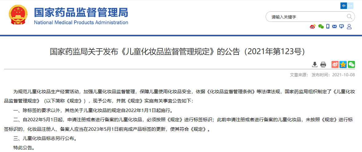 國家藥監(jiān)局關于發(fā)布《兒童化妝品監(jiān)督管理規(guī)定》的公告(2021年第123號