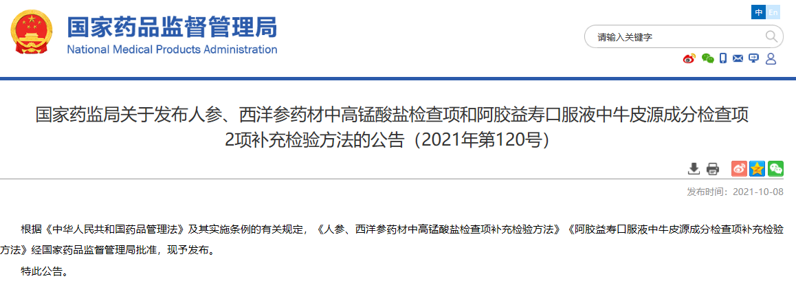 國家藥監(jiān)局關于發(fā)布人參、西洋參藥材中高錳酸鹽檢查項和阿膠益壽口服液中牛皮源成分檢查項2項補充檢驗方法的公告(2021年第120號)