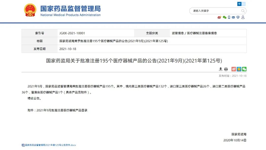 國家藥監(jiān)局關于批準注冊195個醫(yī)療器械產(chǎn)品的公告(2021年9月)(2021年第125號)