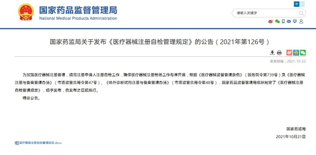 國家藥監(jiān)局關于發(fā)布《醫(yī)療器械注冊自檢管理規(guī)定》的公告(2021年第126號)