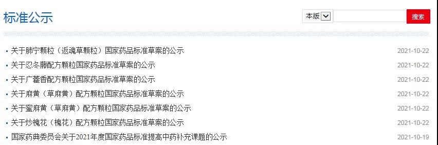 本周肺寧顆粒(返魂草顆粒)、忍冬藤配方顆粒、廣藿香配方顆粒、麻黃(草麻黃)配方顆粒、蜜麻黃(草麻黃)配方顆粒、炒槐花(槐花)配方顆粒國家藥品標準草案的公示,2021年度國家藥品標準提高中藥補充課題公示。