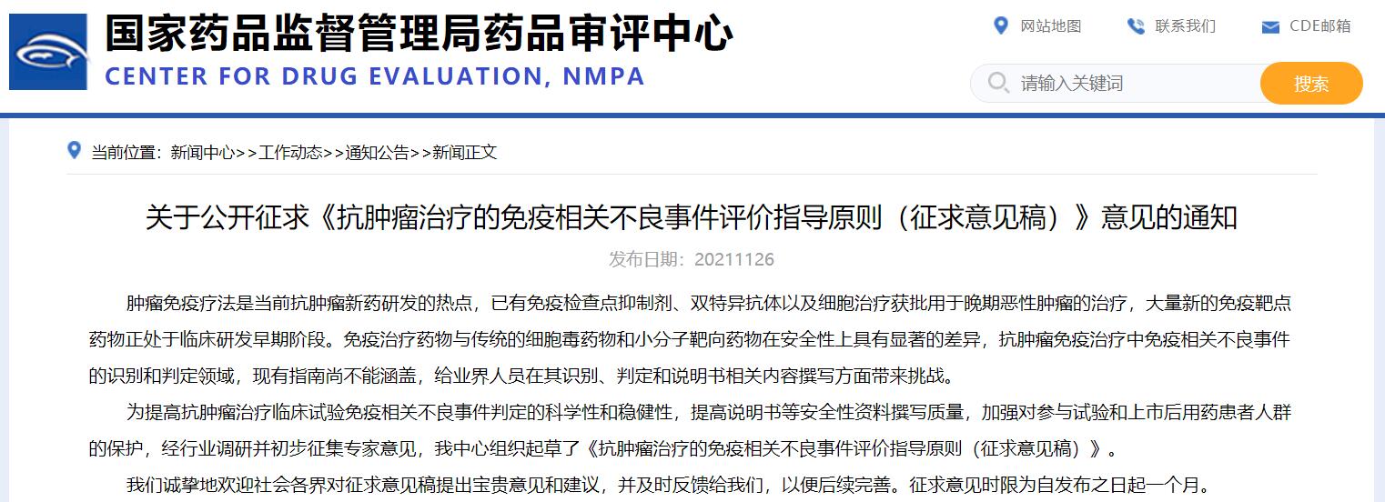 關于公開征求《抗腫瘤治療的免疫相關不良事件評價指導原則(征求意見稿)》意見的通知