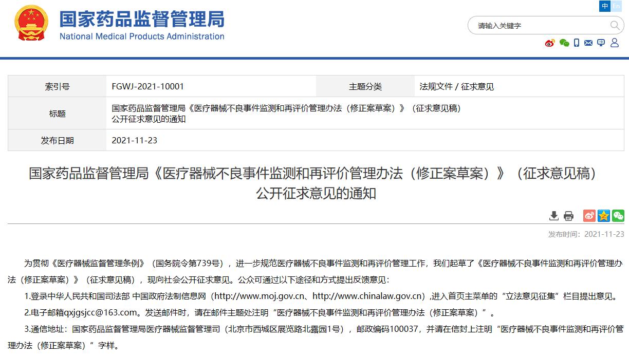 國家藥品監(jiān)督管理局《醫(yī)療器械不良事件監(jiān)測和再評價管理辦法(修正案草案)》(征求意見稿)公開征求意見的通知
