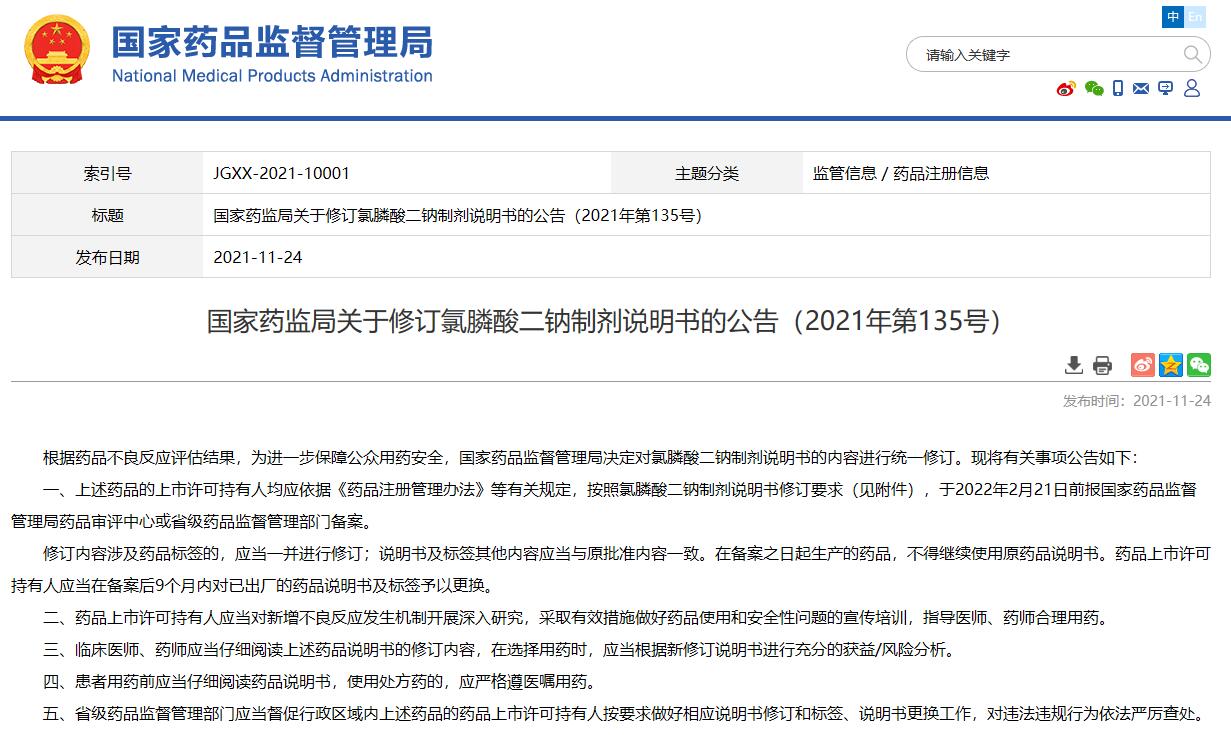 國家藥監(jiān)局關于修訂氯膦酸二鈉制劑說明書的公告(2021年第135號)