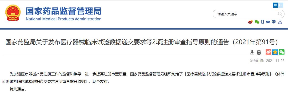 國家藥監(jiān)局關于發(fā)布醫(yī)療器械臨床試驗數(shù)據(jù)遞交要求等2項注冊審查指導原則的通告(2021年第91號)
