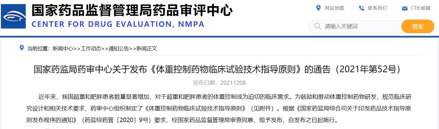 國家藥監(jiān)局藥審中心關(guān)于發(fā)布《體重控制藥物臨床試驗(yàn)技術(shù)指導(dǎo)原則》的通告(2021年第52號)