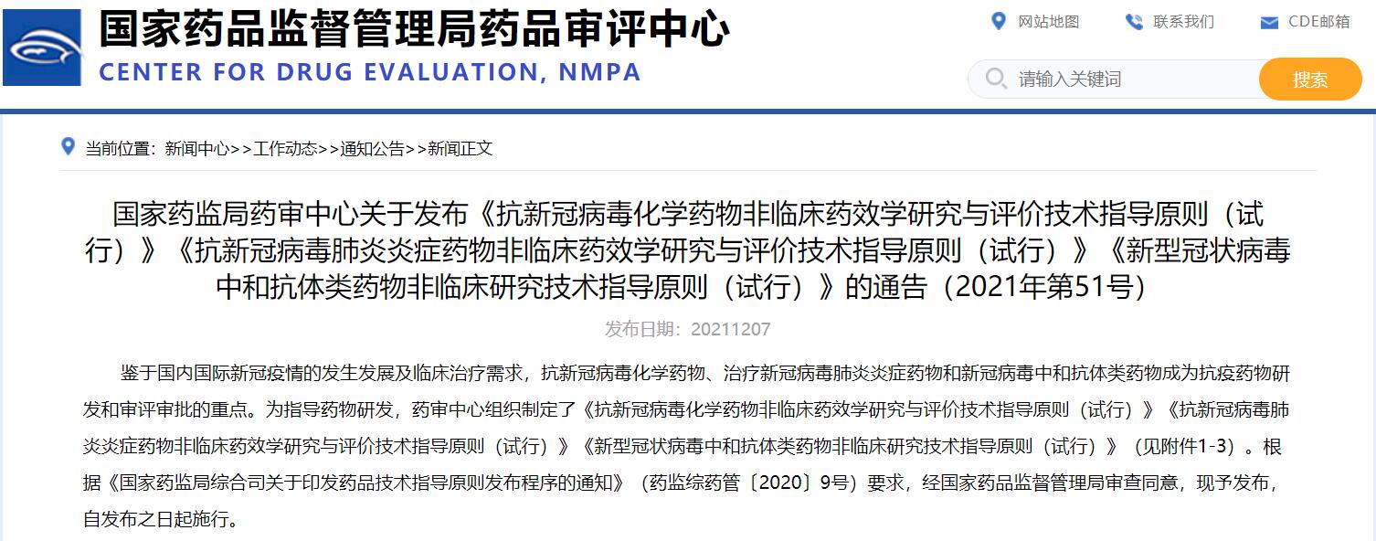 國家藥監(jiān)局藥審中心關(guān)于發(fā)布《抗新冠病毒化學(xué)藥物非臨床藥效學(xué)研究與評價技術(shù)指導(dǎo)原則(試行)》《抗新冠病毒肺炎炎癥藥物非臨床藥效學(xué)研究與評價技術(shù)指導(dǎo)原則(試行)》《新型冠狀病毒中和抗體類藥物非臨床研究技術(shù)指導(dǎo)原則(試行)》的通告(2021年第51號)