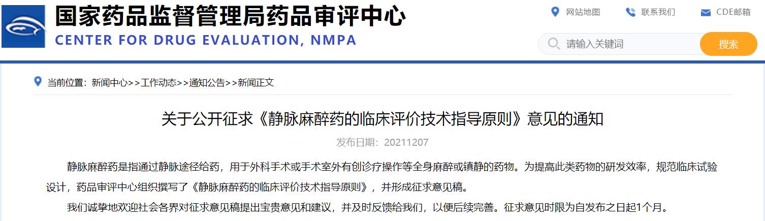 關(guān)于公開征求《靜脈麻醉藥的臨床評價技術(shù)指導(dǎo)原則》意見的通知