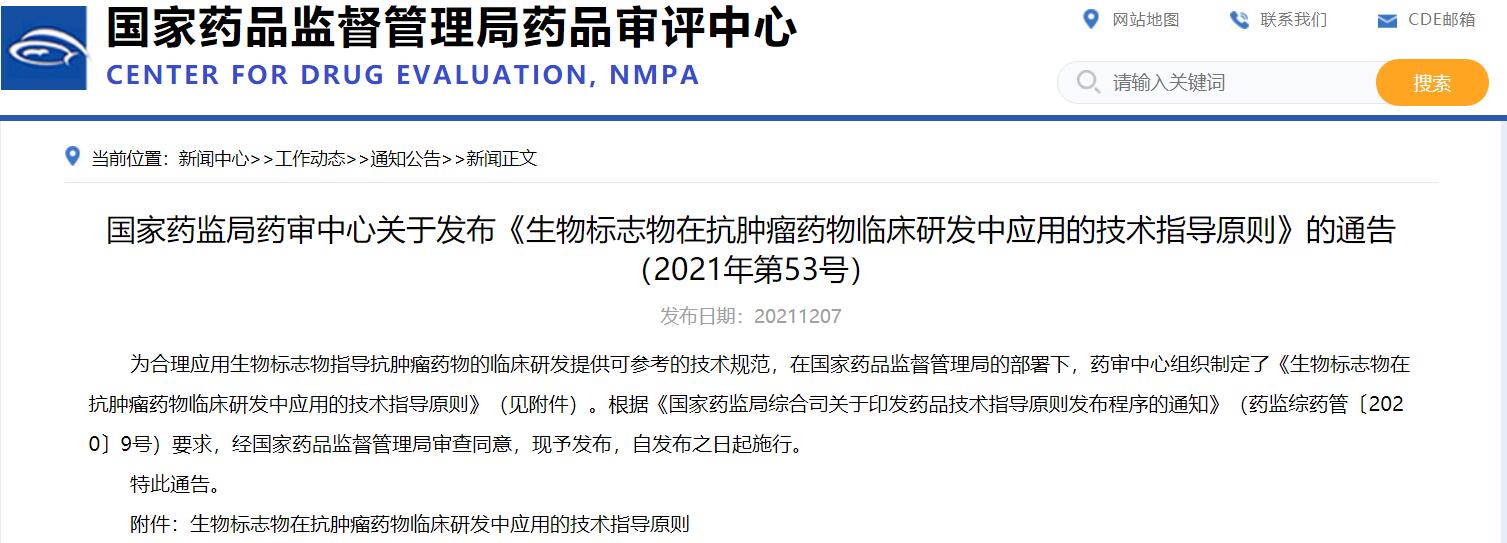 國家藥監(jiān)局藥審中心關(guān)于發(fā)布《生物標(biāo)志物在抗腫瘤藥物臨床研發(fā)中應(yīng)用的技術(shù)指導(dǎo)原則》的通告(2021年第53號)